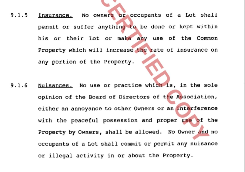 and as an HOA Covenant under 9.1.6 Nuisances and there is 9.1.5 Insurance also for consideration.